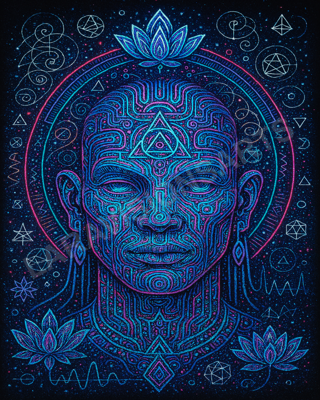 El rostro de la deidad está cubierto por texturas laberínticas realizadas con técnica de líneas de neón ultra-detalladas, donde se incrustan patrones de geometría sagrada, como espirales de Fibonacci, sólidos platónicos y símbolos alquímicos flotando en el espacio circundante. La composición está centrada y rodeada por una mandorla energética, que refuerza el carácter sagrado y cósmico del ser representado.