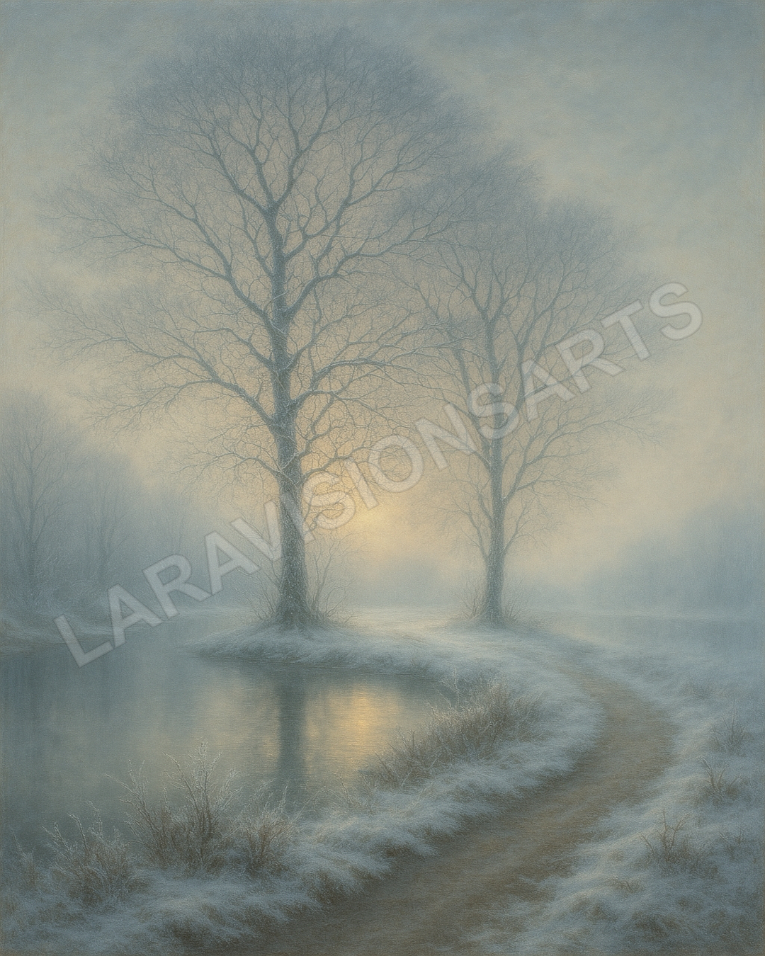 Esta obra de arte digital titulada “Paisaje invernal con río y neblina” captura con maestría la serenidad del invierno en un entorno natural. La composición presenta un camino sinuoso junto a un río tranquilo, flanqueado por dos árboles desnudos que se alzan con elegancia en medio de una atmósfera brumosa. La paleta de colores fríos y suaves refuerza la sensación de calma, mientras que el reflejo de los árboles en el agua añade una dimensión contemplativa.