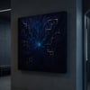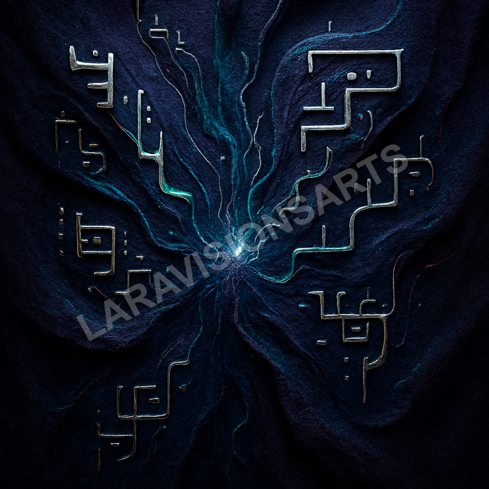 Desde el centro de la composición, una singularidad luminosa irradia energía hacia dimensiones plegadas, como si el espacio mismo se replegara en reverencia. A su alrededor, fluyen ríos neuronales de luz cuántica, tejidos con precisión imposible, que conectan fragmentos de un lenguaje techno-sagrado inventado, sin alfabeto reconocible ni símbolos terrenales. Estos glifos futuristas, flotantes y parcialmente incrustados en superficies de terciopelo dimensional, evocan una sabiduría que trasciende la humanidad.
