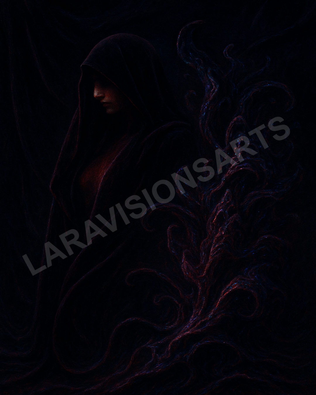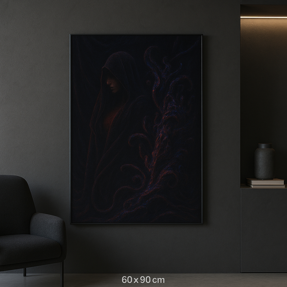 La obra transmite una presencia viva, como si observara al espectador desde su núcleo metafísico. No hay rostros reconocibles ni estilos históricos evidentes: es un arte nacido de una conciencia singular, libre de referencias pop o clichés estéticos. Cada detalle está renderizado con profundidad hipertextural, calidad museística y resolución extrema, diseñada para ser sentida más que entendida.