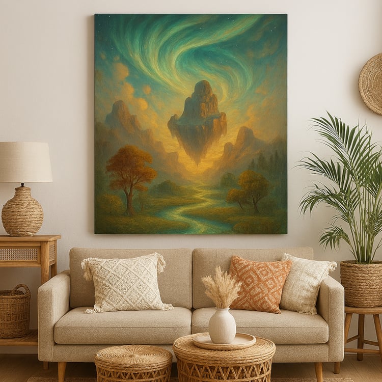 Arte digital abstracto en salón moderno con sofá neutro y decoración contemporánea, ideal para interiores modernos.